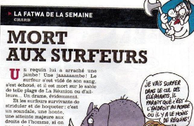 Charlie Hebdo a décidé cette semaine de lancer un pavé dans la mare, et pas des moindres, après la polémique soulevée à la Réunion par la récente multiplication des attaques de requin. Dans sa Fatwa de la Semaine, le directeur de la publication Stéphane Charbonnier alias Charb s’en prend aux surfeurs au travers d’un texte d’une rare violence sur la forme, qui provoque déjà de vives réactions sur les réseaux sociaux.