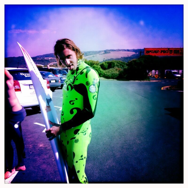 Ça commençait à nous manquer ! Après le léopard, les dollars, les seins nus, les sardines et les motifs psychédéliques, il semblerait que les fameuses combinaisons loufoques de Wilko aient repris du service pour la saison 2012. En effet, l’Australien connu pour ses délires déjantés vient de publier sur son compte Facebook cette photo ou il apparaît avec un air pour le moins malsain, et vêtu de ce qui pourrait bien être sa nouvelle combinaison pour l’épreuve de Bell’s Beach qui commence dans quatre jours.