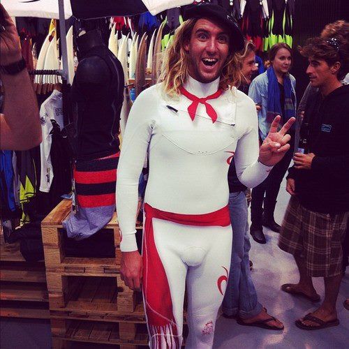 C’est désormais devenu une tradition qui donne lieu à tout un tas de pronostics. Après entre autres les dollars à New-York, le léopard à J-Bay, les sardines à Peniche et les seins nus en France l’année dernière, Matt Wilkinson dévoilait hier soir sa nouvelle combinaison pour le Quiksilver Pro France qui vient de débuter ce matin. Pour succéder au cliché du top less français, le trublion australien se devait de taper dans une tenue emblématique de la région : l’habit de lumière des fêtes de Bayonne. Foulard rouge autour du coup et autre cinta de la même couleur, voilà ce qu’arborera Wilko sur sa combi dans les beachbreaks français au cours des dix jours à venir. Voilà qui devrait annoncer une compète plutôt festive !