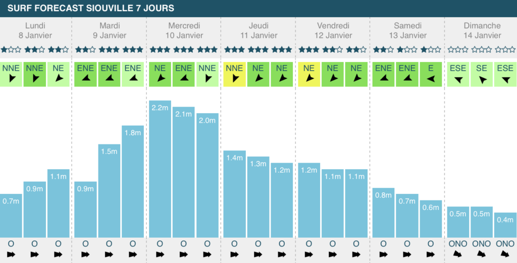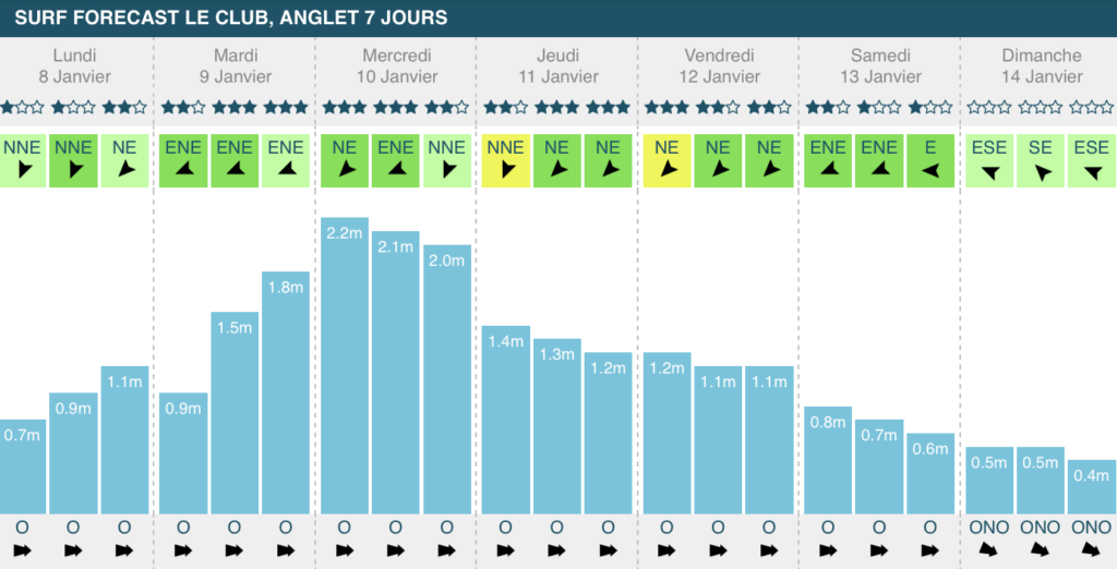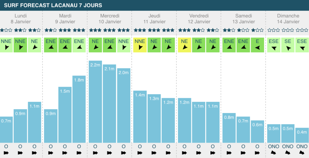 La taille retombera ensuite pour permettre des sessions pour tous en fin de semaine : 1m20 jeudi, 1m10 vendredi et 80cm offshore samedi matin.