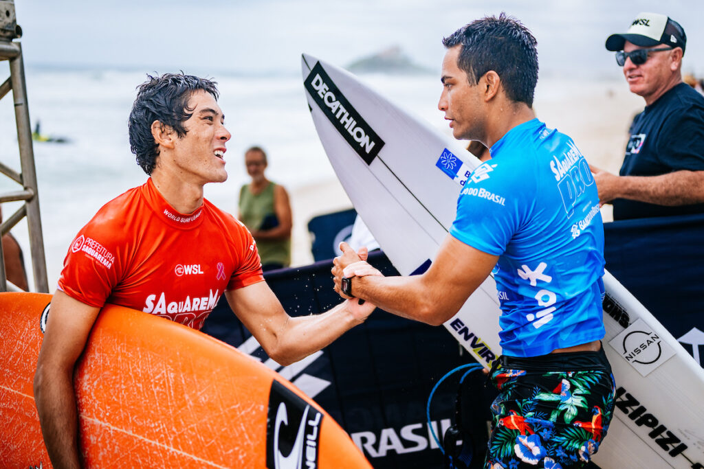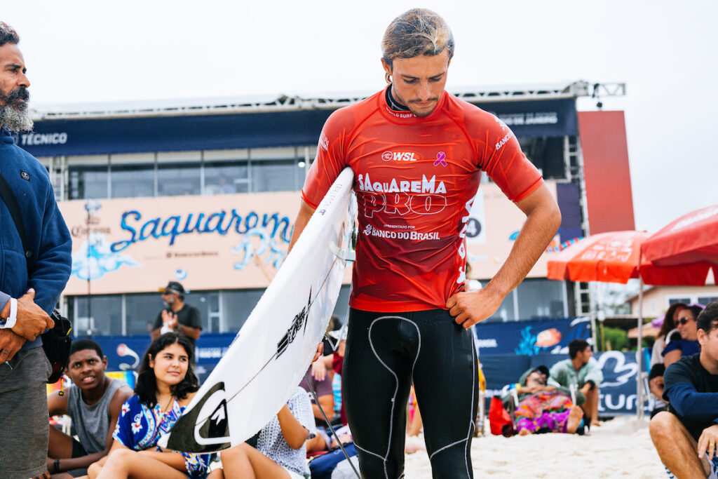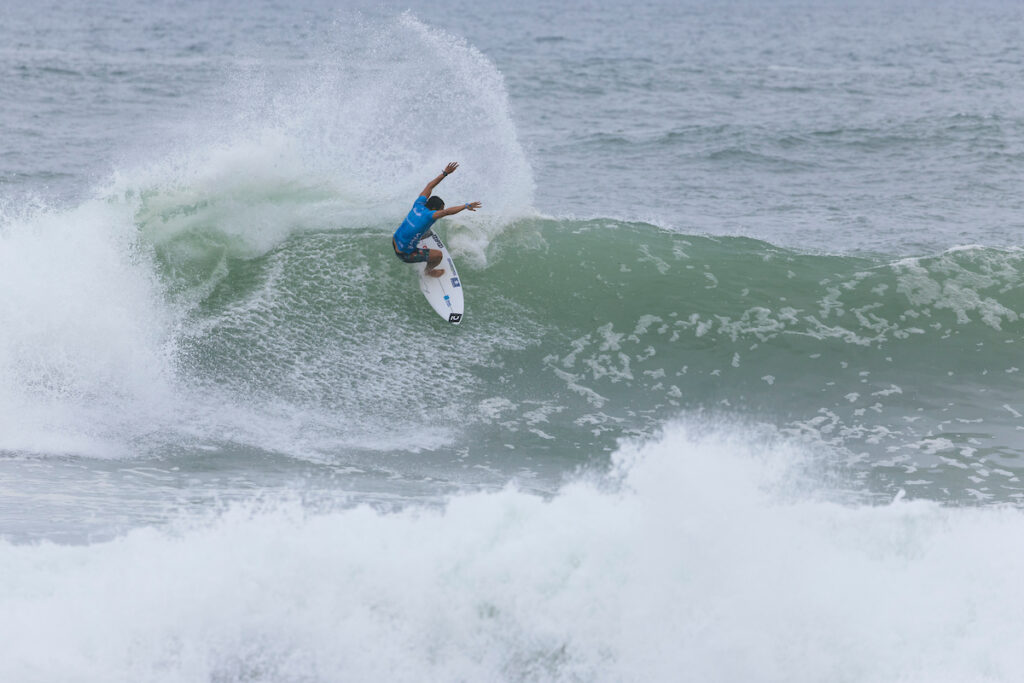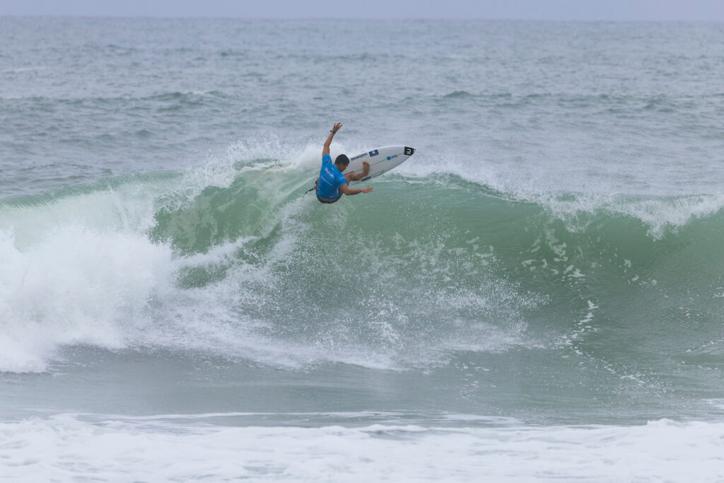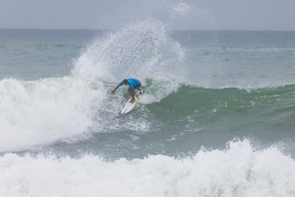 De l’autre côté du tableau, un autre surfeur français fait des étincelles. Comme Mihimina Braye ne dispute que son 3e CS de l’année, il n’est pas là pour se qualifier mais juste pour gagner. A l’inverse son adversaire en huitièmes, Mateus Herdy, 10e au classement avant Saquarema, validerait son billet pour le CT en gagnant cette série . Le tahitien ne lui fait pas ce cadeau. Il reste actif sur les vagues inside qui sont déjà bien copieuses, notamment cette gauche où il joue un numéro d’équilibre sur la première section qui tombe, puis arrivant un peu tôt pour la deuxième, pousse fort sur son rail pour augmenter l’amplitude de son carve. 6,50 c’est le meilleur score, et même si Herdy reviendra dans la course à la faveur d’une seule manœuvre, c’est bien Braye qui passe !