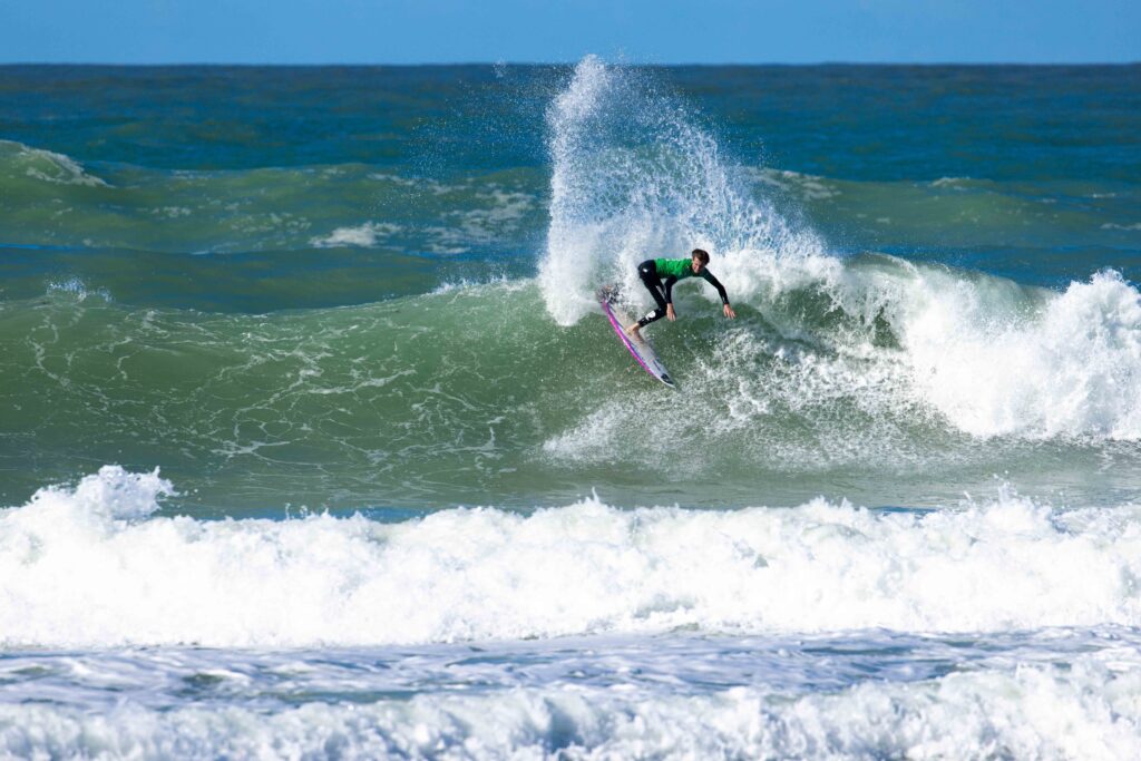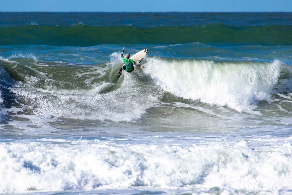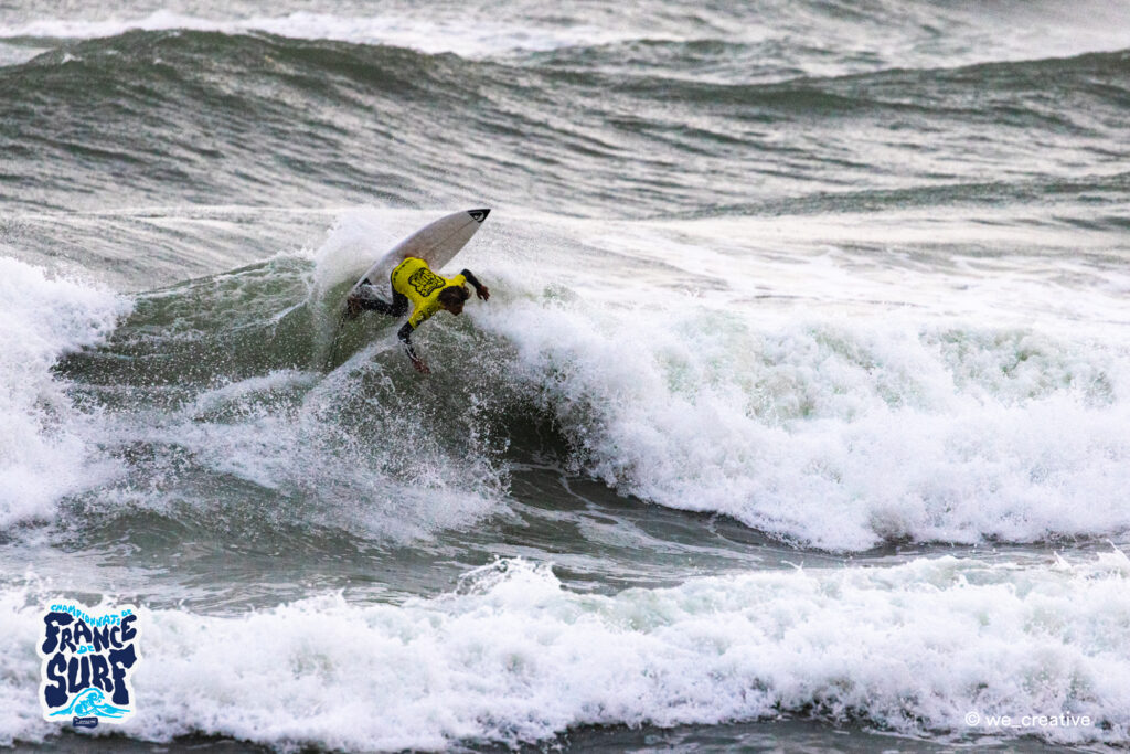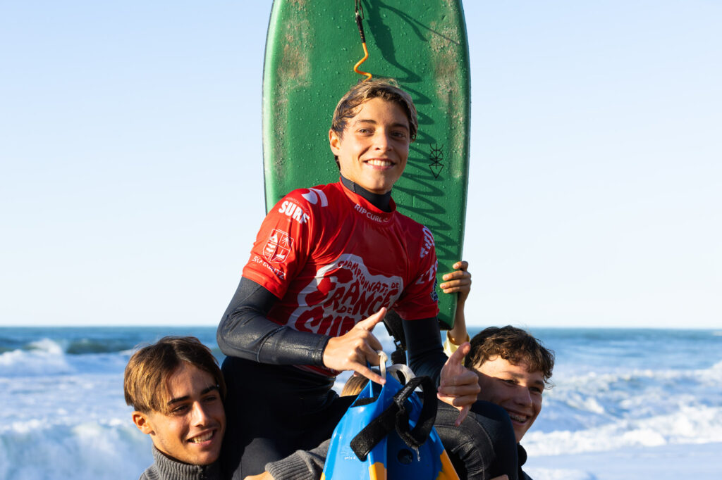 Pour sa dernière année chez les juniors, le Breton Enzo Vildina est allé décrocher le titre de champion de France, lui qui avait terminé vice-champion l’année dernière sur cette même plage. Auteur des meilleures vagues du jour, que ce soit en finale (7,57 pts) mais surtout en ½ (un 9 pts monstrueux), Enzo a survolé cette journée. En finale, et dans des conditions engagées, il a dû néanmoins batailler pour prendre une première place longtemps occupée par Milo Lautier (2e), qui avait lui décroché le titre de champion de France l’année dernière chez les cadets. Timeo Zaninotto (3e) et le Basque Martin Iribarne (4e) complètent le podium. Encore aux Canaries pour le Fronton King il y a quelques jours, Enzo Vildina doit certainement se dire ce soir que ça valait le coup de remettre la combi ! On le verra désormais en Open l’année prochaine. C’est le troisième titre de champion de France glané par la Bretagne sur ces championnats de France 2023 (après ceux hier de Benoît Carpentier et Marine Kerdreux en SUP).