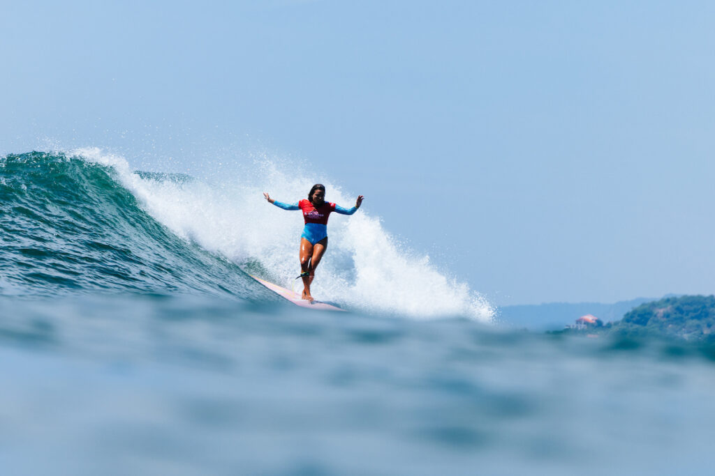 Alice Lemoine est son adversaire du match 3. L’année dernière c’est dans le match 2 qu’elle s’était retrouvées, et le match retour s’annonce combatif puisque les deux surfeuses luttent pour la prio dès la première vague. Les feuilles de note se remplissent de petits scores avant que les surfeuses trouvent chacune un 7. Alice a encore besoin d’un 5,85 quand elle s’élance sur la dernière vague de la série. Elle place directement ses orteils sur le nose avant de négocier des sections plus poussives. C’est un 5,23 pour les juges, et la triple championne du monde poursuit sa route après avoir sorti les deux françaises…