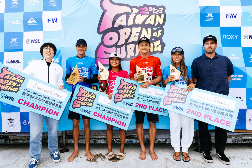 Le Taiwan Open of Surfing (QS 5000) s’est achevé hier, dimanche 12 novembre, à Jinzun Harbor dans le comté de Taitung sur la côte est de Taïwan. Les quarts de finale, les demi-finales et les finales masculines et féminines se sont tenus avant le couronnement des vainqueurs : l’Australien Dakoda Walters et la Japonaise Sara Wakita. Chez les filles la seconde place a été remportée par une autre Japonaise, Amuro Tsuzuki, médaillée de bronze olympique et par l’Australien Joel Vaughan chez les garçons.