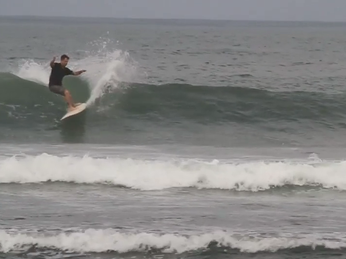 Réputé autant pour ses qualités de noserider que pour son surf très moderne en longboard, CJ Nelson évolue ici dans un registre encore différent. Avec un hull 8’4 sous les pieds shapée par le maître en la matière Greg Liddle, le surfeur de Santa Cruz s’acclimate aux caractéristiques particulières de ce type de planche : carène convexe, rocker faible, répartition des volumes déroutante.