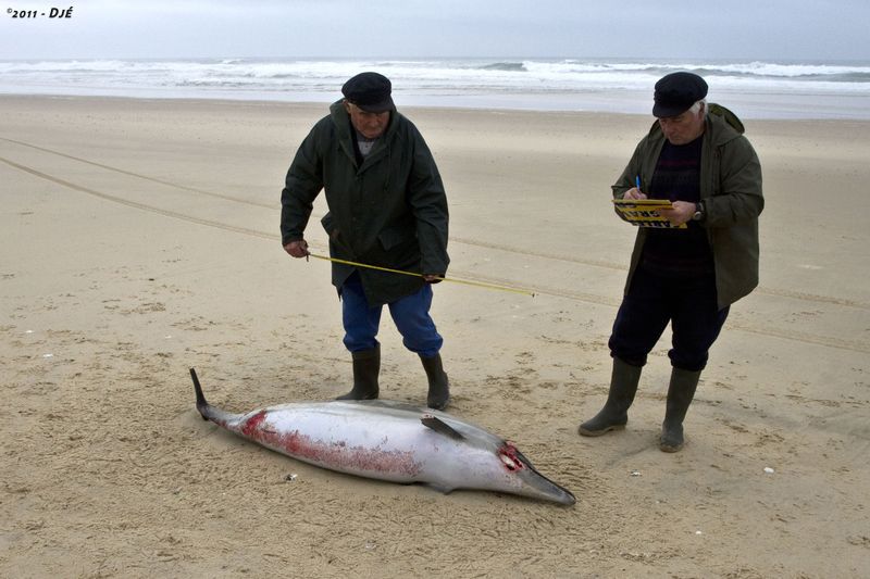 Accompagné de deux bénévoles du Centre de Recherche sur les Mammifères Marins de la Rochelle, je découvre ce triste massacre, sur une dizaine de kilomètres. Cinq d’entre eux sont répertoriés de Lacanau à Hourtin, dont deux sur la plage centrale de Lacanau.