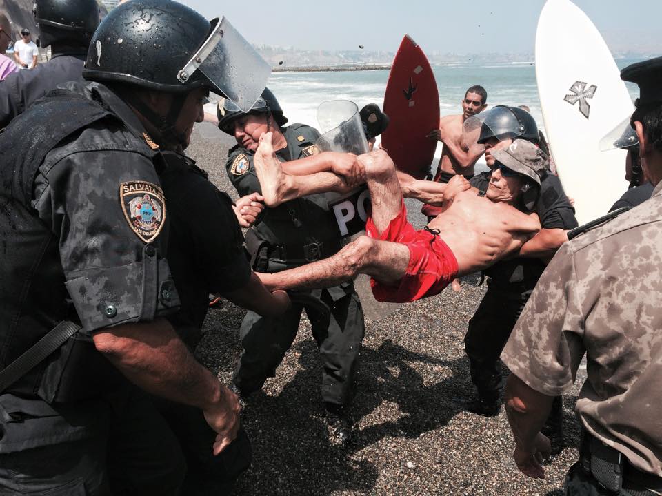 Une chaîne humaine défie les engins de chantiers venus déposer des rochers pour consolider la route qui jouxte le spot de La Pampilla, à proximité de Lima, la capitale du pays. La police charge, casque sur le crâne, bâton et bouclier en mains : la scène est aussi violente que surréaliste.