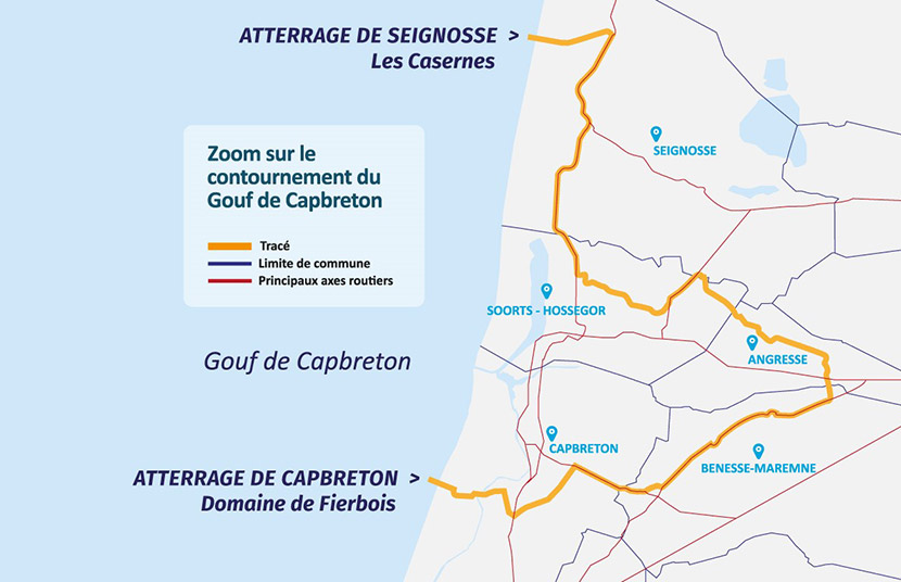 L’interconnexion électrique prévoit de relier Cubnezais (près de Bordeaux) à Gatika (proche de Bilbao) à travers le golfe de Gascogne. Si le tracé est majoritairement sous-marin, il doit effectuer une déviation terrestre pour contourner le gouf de Capbreton. Le projet prévoit une sortie des câbles à Seignosse, traversant la dune, la forêt et cinq villages landais avant de retrouver l’océan à Capbreton.
