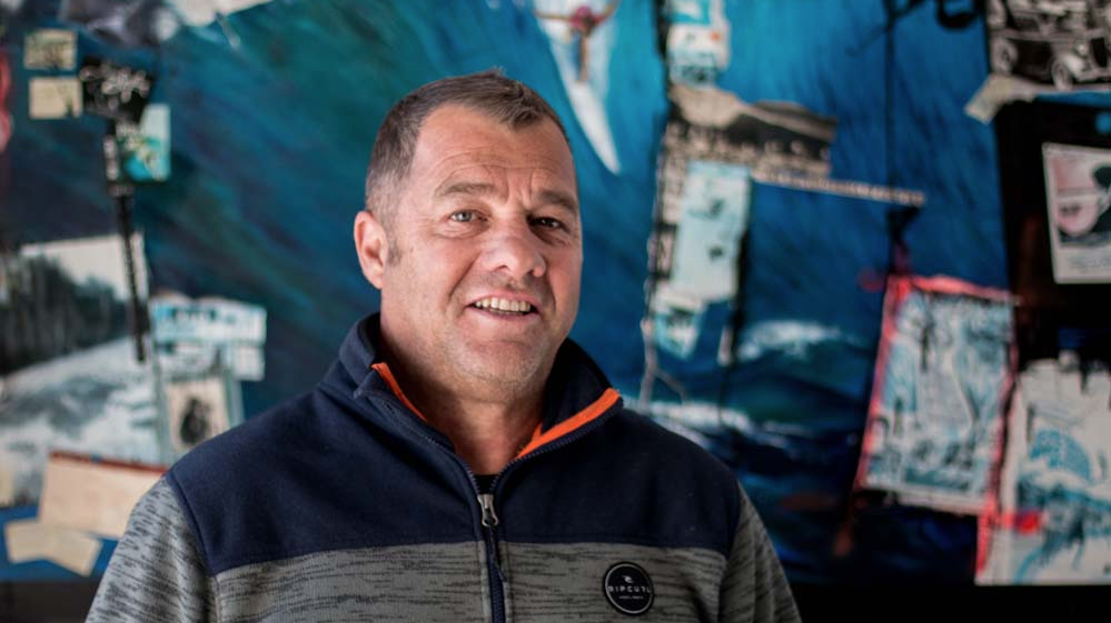 Kiki n’est pas seulement le propriétaire de Bahia Surf Shop, qui fait face à la Baie des Sables depuis près de 25 ans. C’est aussi et surtout la mémoire du surf vendéen, dont il a écrit certaines des plus belles pages.