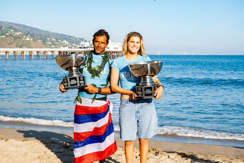 Soleil Errico et Kai Sallas ont été sacrés champions du monde de longboard WSL 2023 cette nuit à Malibu, à l’issue de la quatrième et dernière étape du Longboard Tour. C’est un troisième titre mondial pour Soleil Errico qui remporte ces championnats à domicile pour la seconde fois, tandis que Kai Sallas remporte son tout premier titre mondial. Cette journée de finales s’est déroulée en plays-offs, réunissant les tops 8 hommes et femmes du classement, déterminés à la fin de la saison régulière. Les deux Français encore en lice, Edouard Delpero (numéro 6) et Alice Lemoigne (numéro 5), ont malheureusement été éliminés dès leur premier match. Les Hawaiiens Kelis Kaleopa’a et Kaniela Stewart, originaires de Waikiki, ont terminé à la seconde place de ces championnats. La journée s’est déroulée dans des conditions petites et propres, sans brouillard, ce dernier ayant empêché les plays-offs d’être lancés ce week-end.