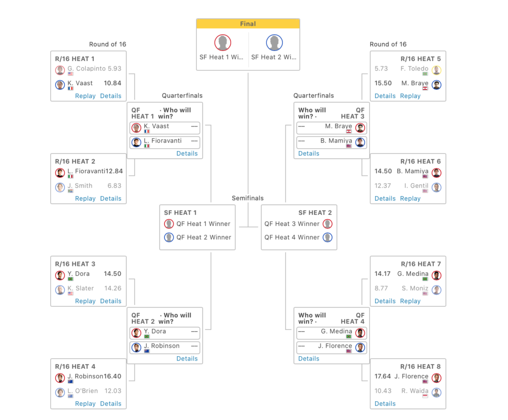 Mihimana Braye, remplaçant pour cause de blessure, a lui aussi obtenu sa place en quarts de finale après avoir éliminé l’actuel numéro un mondial et champion du monde en titre Filipe Toledo en 16e de finale. Braye était en tête avec un 7,00 et n’a laissé aucune chance à Toledo de répliquer, affichant un excellent 8,50 dans les dernières secondes du heat. C’est la toute première fois que le Tahitien prend part à une épreuve du CT et il représente une réelle menace pour les meilleurs mondiaux.