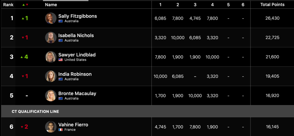 La surfeuse américaine a remporté hier une victoire remarquable et occupe désormais la troisième place du classement général des Challenger, en passe pour se qualifier sur le CT. Elle a disputé sa finale contre la très expérimentée Sally Fitzgibbons qui lui a mis la pression dès les premières minutes de la série. L’Australienne a scoré un 7,17 impressionnant et avait six points de plus que son adversaire à la quinzième minute de la série, mais Sawyer Lindblad a répliqué, obtenant un 7,60 avant de réaliser un autre coup d’éclat en scorant un 8,93 venu consolider le résultat le plus important de sa carrière jusqu’à aujourd’hui.