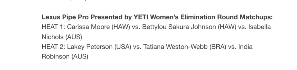 Caroline Marks, championne du monde en titre, a réussi à passer sans encombre sa première série pauvre en vagues, en obtenant des scores minimes mais suffisants sur ses turns backside. Pendant les 30 minutes de leur série où l’action était à la peine, India Robinson et la locale Moana Jones Wong, spécialiste de Pipe, ont eu du mal à trouver des opportunités et ce n’est pas faute d’avoir cherché. C’est finalement, c’est l’Hawaïenne qui s’est hissée à la deuxième place, envoyant l’Australienne aux repêchages.