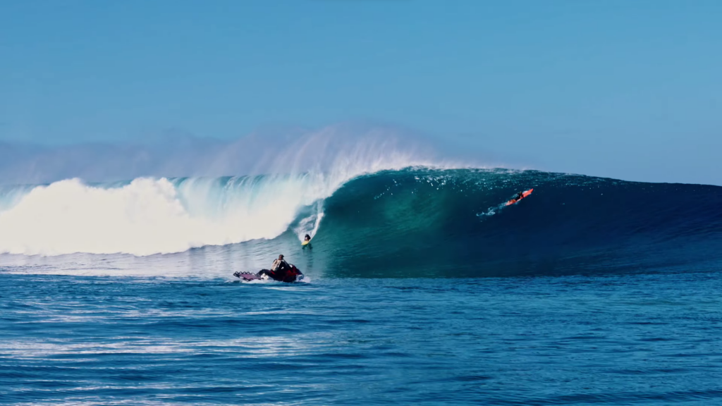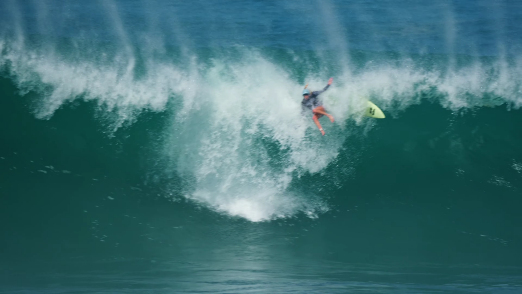 Laura n’a jamais eu de mal à s’engager et elle commence même à cumuler une certaine expérience en matière de grosses vagues. Cela se ressent dans les images que l’on voit d’elle sur cette droite monstrueuse qui casse au large. Équipée de son grand gun jaune conçu par le chargeur australien Dylan Longbottom, elle part de plus en plus deep au point de se faire rattraper par la mousse.