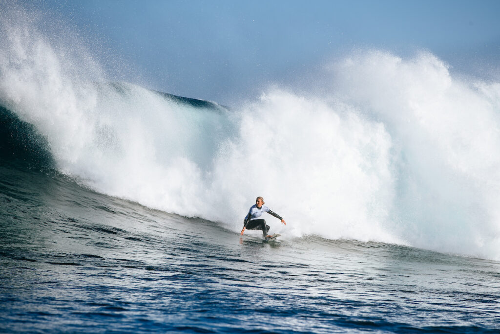 L’expérience de Stephanie Gilmore et Lakey Peterson a fait la différence au premier tour alors qu’elle étaient opposée à Caitlin Simmers dans un heat intergénérationnel. L’Australienne et l’Américaine ont livré une performance à hauteur de leurs capacités. Leur excellente lecture de vague les a menées à faire le meilleur choix de manœuvres possible, le tout donnant lieu à une synchronisation déconcertante sur leur vague notée 8.00 points et quelques. En face, la rookie victorieuse au Portugal, vient officiellement de passer le cut suite aux points récupérés sur l’opening round. Sa motivation à toutes épreuves l’a menée à finir dos sur les cailloux en fin de vague. Un replay qui vaut le détour.