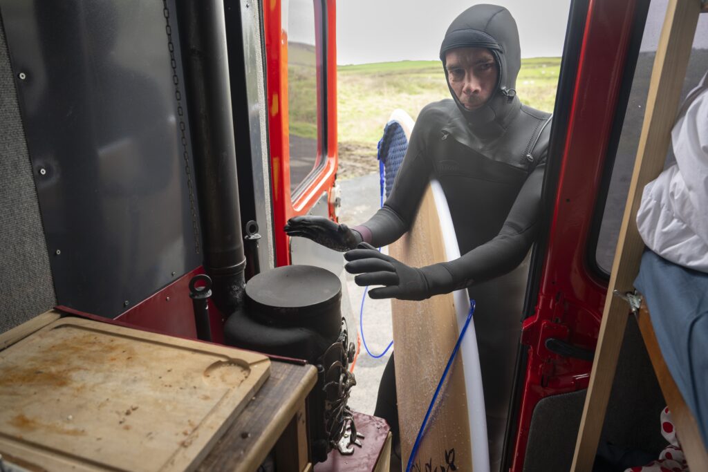 Ewen Le Goff – « On a choisi cette destination parce que l’on savait qu’il y avait de bonnes vagues, peu de monde, potentiellement des spots à découvrir et surtout de l’huile de frites qui trainait dans ce pays-là. On voulait aussi aller un peu dans le froid avec le camion. Ronan et Aurel y étaient déjà allés il y a longtemps. On est retourné à quelques endroits qu’ils connaissaient, notamment les spots que Ronus avait découvert, même si ça n’a pas toujours été un succès. Puis on est parti en cruising hors des sentiers battus et là on a trouvé des bonnes vagues, c’était cool ! On a vraiment eu de la chance au niveau des vagues, quasiment tout au long du trip on a eu des grosses houles, du vent off shore, il y a avait des vagues toute la journée. On a surfé des vagues molles à très creuses voire des slabs bien engagés. Je voulais essayer d’avoir un gros tube que je n’ai pas eu, mais on a quand même eu quelques tubes et pas mal de sensations à fleur de caillou. On a pu faire le plein de vagues et à la fin on était comme on dit surf out, c’était pas l’envie qui nous manquait mais le corps ne suivait plus.