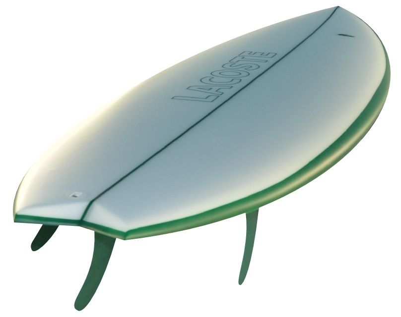Désireux d’étendre son champ d’expression sur des secteurs variés et de projeter la marque dans l’avenir, le département design de LACOSTE, dirigé par Christophe Pillet et Jean-Pierre STARK se sont associés pour mettre au point un shape particulièrement moderne et abouti : un thruster fish 5’11″-20″-2″3/8.