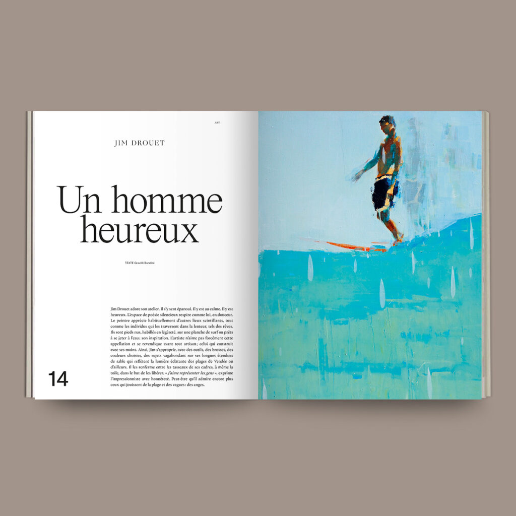 Jim Drouet adore son atelier. Il s’y sent épanoui. Il y est au calme. Il y est heureux. L’espace de poésie silencieux respire comme lui, en douceur. Le peintre apprécie habituellement d’autres lieux scintillants, tout comme les individus qui les traversent dans la lenteur, tels des rêves. Ils sont pieds nus, habillés en légèreté, sur une planche de surf ou prêts à se jeter à l’eau: son inspiration. L’artiste n’aime pas forcément cette appellation et se revendique avant tout artisan; celui qui construit avec ses mains. Ainsi, Jim s’approprie, avec des outils, des brosses, des couleurs choisies, des sujets vagabondant sur ses longues étendues de sable qui reflètent la lumière éclatante des plages de Vendée ou d’ailleurs. Il les renferme entre les tasseaux de ses cadres, à même la toile, dans le but de les libérer. « J’aime représenter les gens », exprime l’impressionniste avec honnêteté. Peut-être qu’il admire encore plus ceux qui jouissent de la plage et des vagues : des anges.