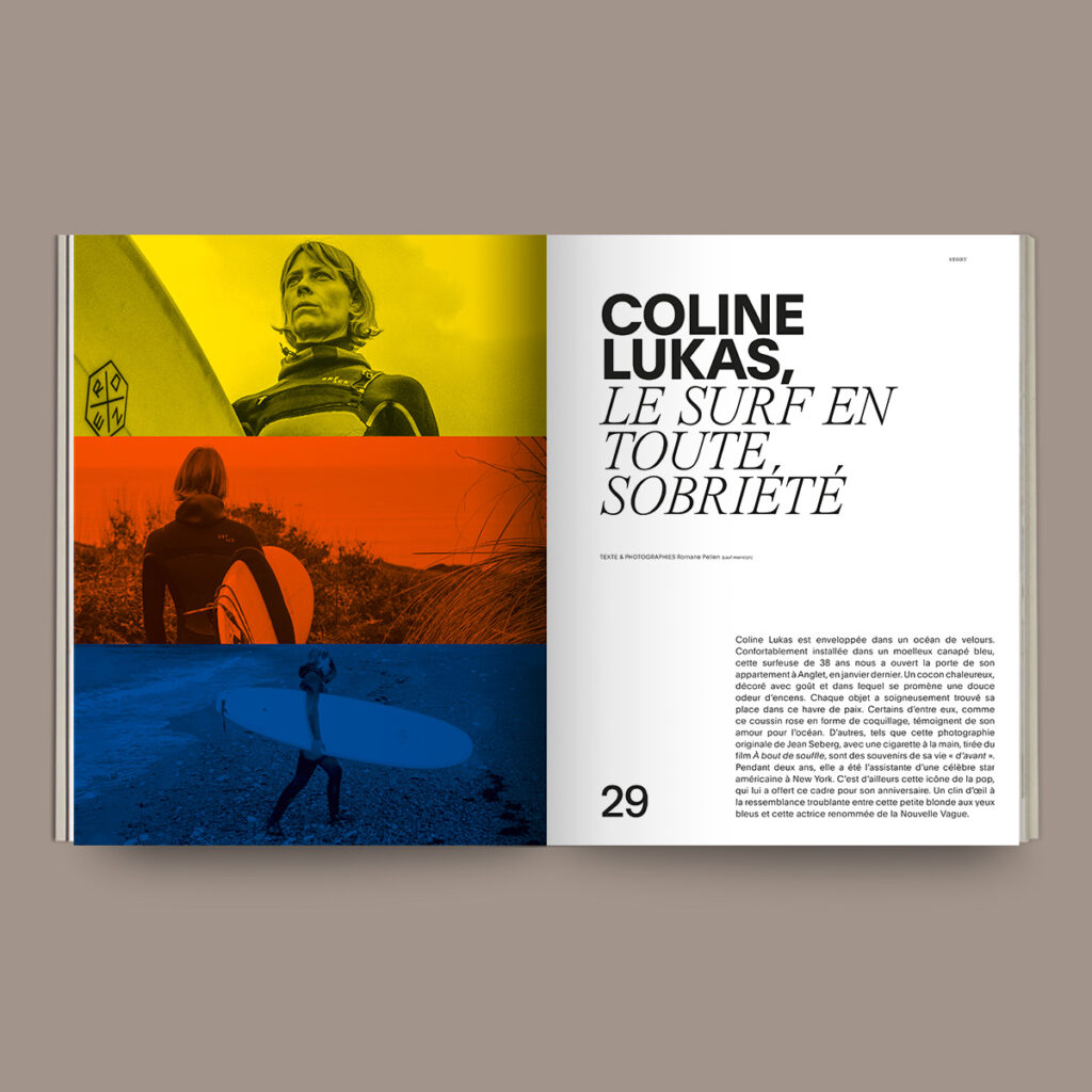 Coline Lukas est enveloppée dans un océan de velours. Confortablement installée dans un moelleux canapé bleu, cette surfeuse de 38 ans nous a ouvert la porte de son appartement à Anglet, en janvier dernier. Un cocon chaleureux, décoré avec goût et dans lequel se promène une douce odeur d’encens. Chaque objet a soigneusement trouvé sa place dans ce havre de paix. Certains d’entre eux, comme ce coussin rose en forme de coquillage, témoignent de son amour pour l’océan. D’autres, tels que cette photographie originale de Jean Seberg, avec une cigarette à la main, tirée du film À bout de souffle, sont des souvenirs de sa vie « d’avant ». Pendant deux ans, elle a été l’assistante d’une célèbre star américaine à New York. C’est d’ailleurs cette icône de la pop, qui lui a offert ce cadre pour son anniversaire. Un clin d’œil à la ressemblance troublante entre cette petite blonde aux yeux bleus et cette actrice renommée de la Nouvelle Vague.