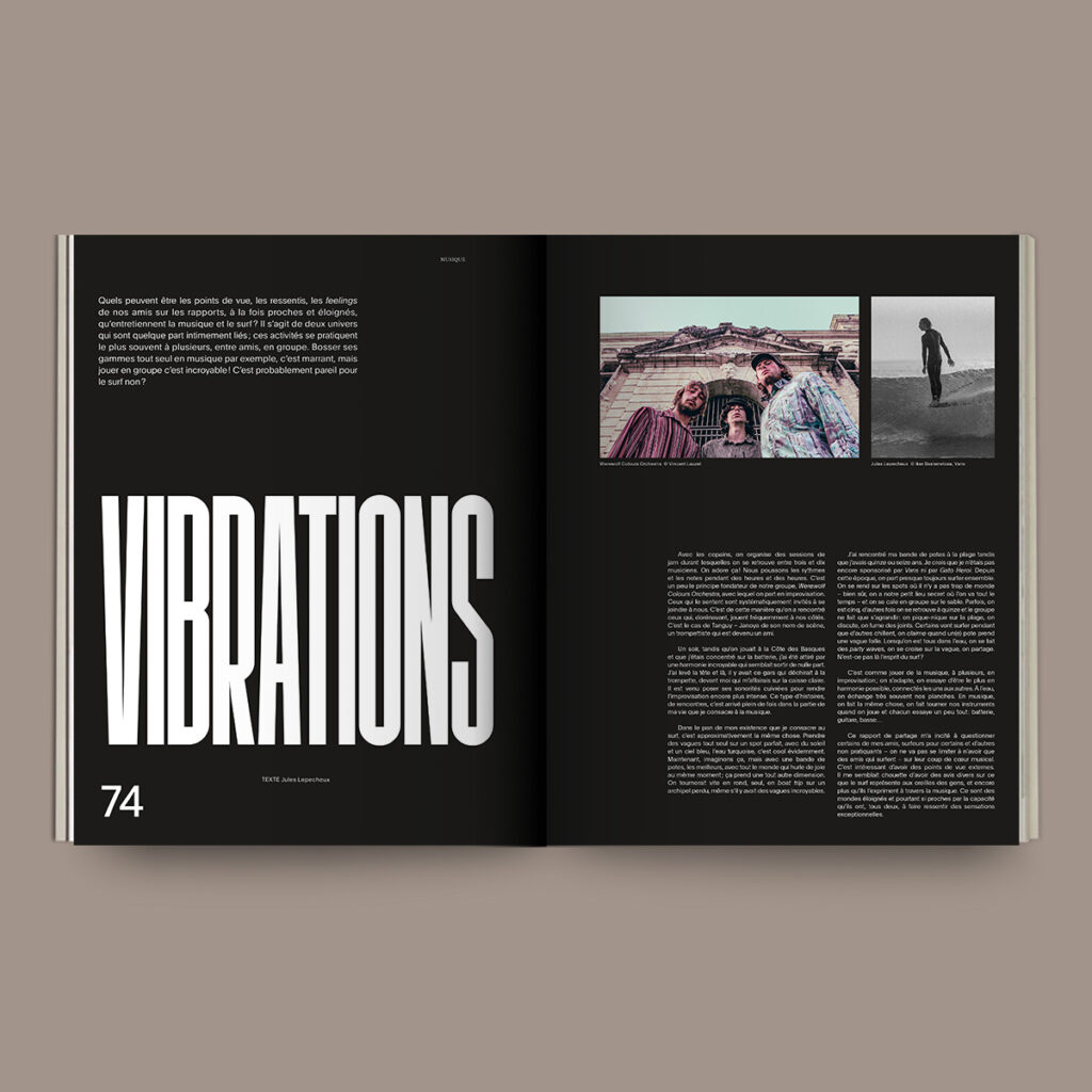 Quels peuvent être les points de vue, les ressentis, les feelings de nos amis sur les rapports, à la fois proches et éloignés, qu’entretiennent la musique et le surf ? Il s’agit de deux univers qui sont quelque part intimement liés ; ces activités se pratiquent le plus souvent à plusieurs, entre amis, en groupe. Bosser ses gammes tout seul en musique par exemple, c’est marrant, mais jouer en groupe c’est incroyable ! C’est probablement pareil pour le surf non ?