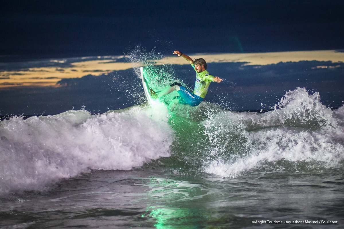 Le Surf de Nuit est une institution à Anglet. Et même si les vagues ne sont pas toujours au rendez-vous, le public, lui, ne loupe jamais l’occasion d’aller observer les surfeurs se jeter à l’eau au clair de lune. C’était le cas vendredi 8 août où, malgré de petites conditions agitées de 50-70cm et un temps plus que menaçant (alerte orange Météo France pour risque d’orages), une partie des meilleurs surfeurs français s’étaient donnés rendez-vous aux Sables d’Or. Présentées l’an dernier, les planches lumineuses de PRZ Surfboards ornaient cette année les planches de tous les riders. Un ballet aquatique retransmis en live sur Dailymotion et surfsesssion.com.