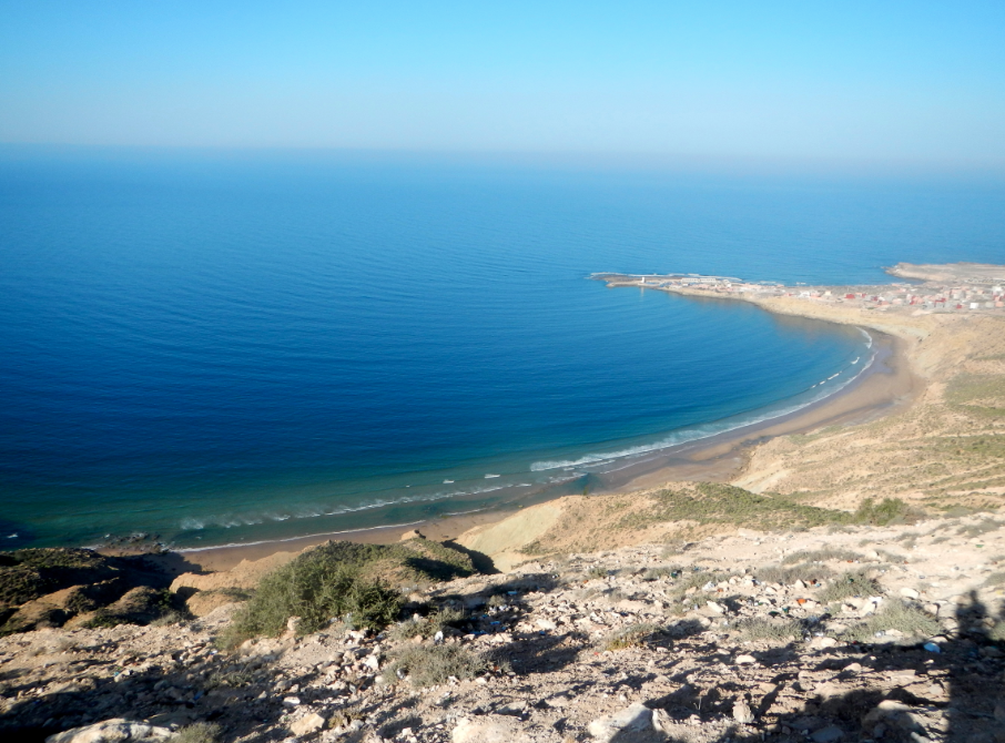 Samedi 25 février, 17h00, le vent tombe, réveil de la sieste. On part alors voir si il y a quelques vagues. Depuis le début du séjour on entend parler de cet endroit où déroule une des plus belles vagues du Maroc. On ne sait pas où elle se trouve, mais on a une petite idée d’où il faut se garer pour y accéder. Bouteille d’eau et combinaisons dans le sac à dos, nous commençons à marcher sur la falaise pour trouver la vague. 15,20, 30 minutes passent avant de trouver un accès plage. Puis arrivés là-bas, déception… Les vagues sont dans tous les sens, des rochers sont à fleur d’eau et le soleil commence à être trop bas pour y voir clair.