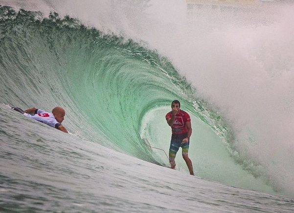 Aucun respect pour les anciens ! Cela s’est passé dans la 3e série du Round 4, Bede Durbidge et Kelly Slater se retrouvent tous deux au bord après avoir pris chacun une vague, et pour désigner la priorité sur le vague suivante, c’est au premier qui arrive au peak. D’où cette course effrénée entre les deux compétiteurs, qui dure bien plus longtemps que sur cet extrait en GIF. À 41 ans, Papy Kelly tient encore la forme.