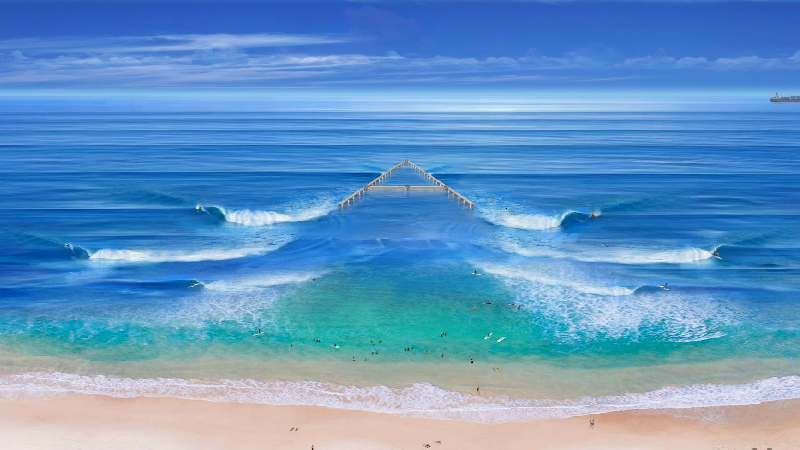 Nettement plus ambitieux, le V-Reef reprend la même idée à plus grande échelle et avec une structure fixée au fond par un pieu. Moyennant près de 2 millions d’euros, une ville pourrait s’offrir une vague de classe mondiale déroulant sur 300 mètres de long. Et comme le reef pourrait monter et redescendre avec la marée, la vague serait parfaite à toute heure de la journée.