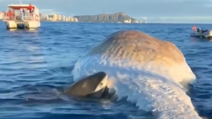 plusieurs requins-tigres qui semblent se régaler du festin.