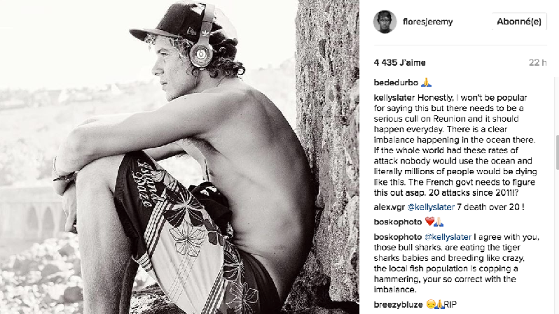 Même Kelly Slater y est allé d’un commentaire sur la photo de la victime publiée par Jeremy Flores sur son compte Instagram. A la surprise générale le Floridien, pourtant grand défenseur des océans, s’est exprimé en faveur de l’abattage de requins sur l’île :