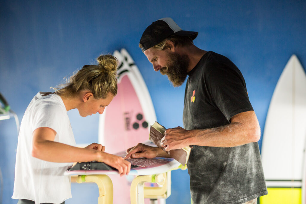 J’essaie vraiment de passer le plus de temps possible avec mes team riders pour construire une bonne relation avec eux. Premièrement, si je ressens une très bonne connection émotionnelle avec l’un de mes riders, je ferai du meilleur boulot. Plus je tiens à eux, plus je mettrai du cœur dans les planches que je leur fais, donc c’est très important pour moi de nouer une belle relation avec eux, une amitié, un amour et un respect mutuels. Deuxièmement, cela permet une meilleure communication. Et la communication est la clé. Mes team riders doivent être capables de me dire « je n’aime pas ça, j’aime bien ça, je trouve ça bizarre… » S’ils ont peur de me dire ce genre de choses parce que notre relation n’est pas assez bonne, ça ne les aide pas. Ils doivent se sentir assez en confiance pour se dire qu’ils peuvent venir me voir pour me dire que telle chose ne marche pas tout en sachant que cela ne change absolument rien. La communication, la connection émotionnelle et l’attachement que je peux avoir pour un surfeur ou une surfeuse me feront faire du bien meilleur travail. En fin de compte mon objectif est de les aider à réaliser leurs rêves. Ce qui compte ce n’est pas le shapeur, c’est le surfeur, ce qui compte ce n’est pas ce que je fais mais c’est ce qu’il ou elle fait. J’ai tout simplement envie de les voir réussir.