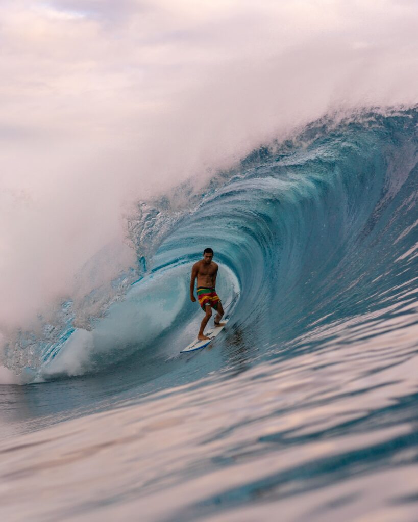 « Pour ma première fois là-bas, j’ai demandé des conseils à Kauli, il m’a donné le nom d’une guesthouse, Tahurai Homestay, dans le village de Teahupoo, un super endroit pour découvrir la culture tahitienne. Après ma quarantaine, je suis resté deux mois là-bas et au fil d’une discussion, Kauli m’a proposé un hébergement chez lui, histoire de rester un mois de plus. » Seul avec la famille Vaast, Paul découvre la culture locale et la vie sur l’île. « Gaël, le père de Kauli, a pris le temps de m’expliquer comment fonctionnait la vague, le récif, m’a rassuré. Je n’avais jamais vraiment photographié de vagues comparables. La première fois, il m’a emmené pendant un sunset magnifique, au bout de dix minutes, j’avais pris plus de jolies photos qu’en un an à Hossegor. Quand je suis sorti, il m’a tendu une bière et on est rentré en jet-ski à fond dans le lagon. Pendant ces huit minutes, ma tête explose. Je viens de faire des photos de ouf, le ciel est encore dingue, je bois ma petite bière, le père de Kauli qui me conduit, mais comment j’ai fait pour en arriver là ? » À écouter Paul parler, on comprend qu’il y a indéniablement le talent, mais aussi une réelle capacité à avancer à l’instinct et à bien s’entourer.
