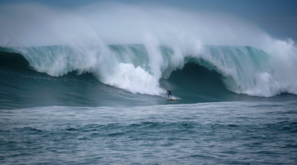 Ce qui était assez particulier, c’est qu’il y avait très peu de monde au pic. Alors que d’habitude, quand c’est gros, il y a du monde à l’eau. Mais là, c’était vraiment très gros. Quand je ramais pour rejoindre le pic, un gars ramait juste devant moi. Une immense série a levé, on s’est assis tous les deux sur notre planche pour la regarder et une fois qu’elle est passé, il a fait demi-tour pour rentrer au port. Une fois que je suis arrivé au fond, une autre série est arrivée et j’étais bien placé, j’ai donc pris une première vague et tout s’est bien passé. J’ai attendu la deuxième série, qui s’est pointée au bout d’une heure. Je suis parti sur une super vague, bien à l’intérieur dans le bol. Puis je suis retourné au fond. Je voyais les lignes au large, je n’arrivais plus à les compter et chaque fois, celle de derrière était encore plus foncée et plus haute que la précédente. Et la plus grosse série de la journée est arrivée…