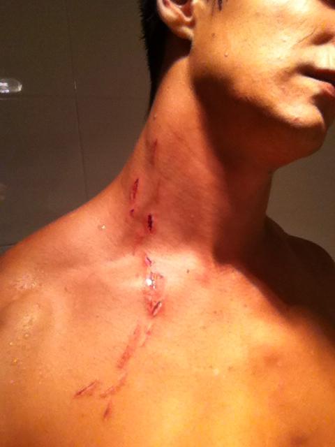 J »avais fait l’erreur de partir surfer seul sur une plage isolée, et elle était déjà fermée, il n’y avait pas de secours. C était une grosse erreur de ma part. Je suis aussitôt sorti de l’eau à la nage, je n’ai pas réfléchi à ma planche que j’ai d’ailleurs laissée là-bas. J’étais évidemment très effrayé. J’ai pris mon sac et j’ai voulu prendre le premier bus pour rentrer chez moi. Je voulais juste prendre un café avec un ami, oublier ça. Heureusement, mon ami avait pris conscience de la gravité de l’accident et m’a donc emmené à l’hôpital. D’après le médecin j’ai eu affaire à un petit requin, d’où la faible profondeur des traces de morsures.