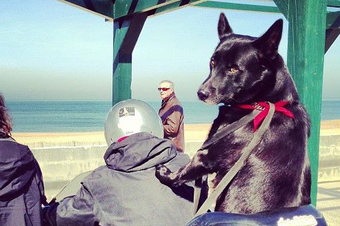Quiconque a déjà croisé le shaper angloye Eric Rougé a forcément aperçu son imposant chien noir au bandana rouge Beltz, jamais très loin de son maître. Un fidèle compagnon qu’Eric trimballe régulièrement derrière lui en moto (voir photo) et sur les plages d’Anglet. Ce “loup” – c’est même son surnom – connait d’ailleurs bien les bureaux de Surf Session, et précède toujours son maître dans l’escalier lors de leurs visites.