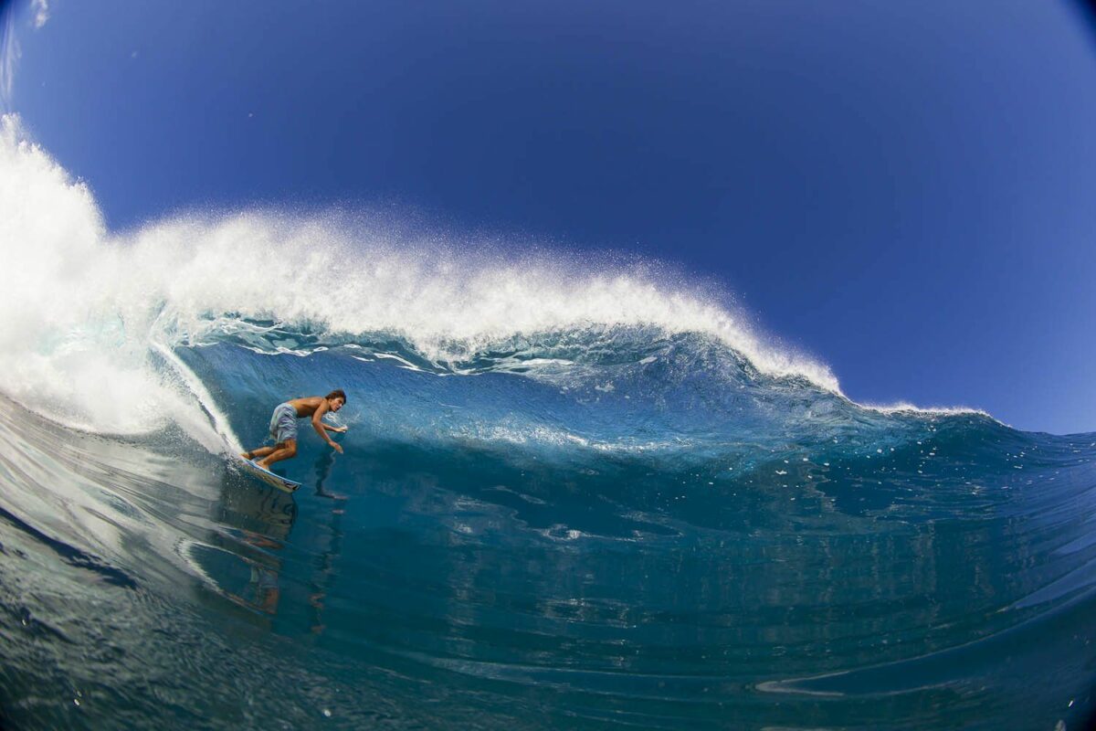 Je me souviens de cette session, un petit matin à Teahupoo, autour de 6 pieds, bien glassy, le rêve pour shooter dans l’eau, et des sessions qu’on n’a pas envie de rater : du lisse, du bleu et du soleil comme on peut le voir sur la séquence. Un bon set-up je dois avouer pour facilement sortir des bonnes images.