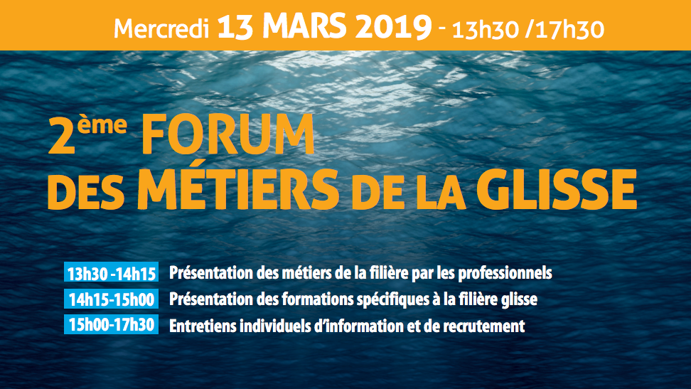 En effet, le mercredi 13 mars prochain, de 13h30 à 17h30, aura lieu une nouvelle édition du forum des métiers de la glisse. Ce forum s’inscrit dans le programme d’activité de la Semaine de l’Emploi Maritime organisée du 11 au 16 mars 2019, par les agences Pôle emploi du littoral. Son but ? Faire connaître la diversité des métiers de la mer, souvent méconnus, promouvoir les formations qui y sont rattachées et rencontrer les entreprises qui recrutent.