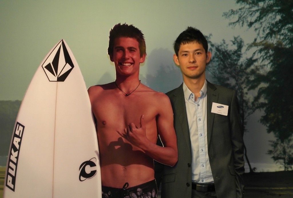 «Rencontre d’un troisième type. Voilà une photo bien étrange digne d’un film de Spielberg. Le contraste est saisissant. Un surfeur doré, roti, gourmand, croquant pose en compagnie d’un jeune coréen qui travaille pour l’entreprise Samsung.