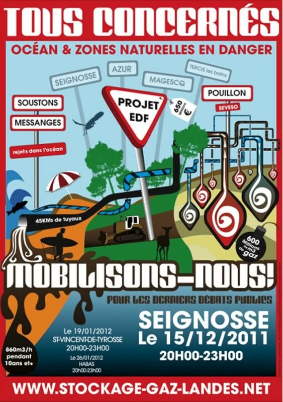 Cinq premiers débats publics ont déjà eu lieu dans une organisation ne laissant que très peu d’opportunités à la discussion. Une mobilisation s’organise pour les derniers débats publics à Seignosse dans les Landes ce jeudi 15 décembre 2011 à 20h. Venez nombreux vous exprimer. En attendant n’hésitez pas à vous renseigner davantage sur le sujet. Et pour ceux qui ne peuvent être présents, donnez votre avis sur le bulletin officiel du projet, comme une pétition contre ce projet de stockage de gaz de Salins des Landes.