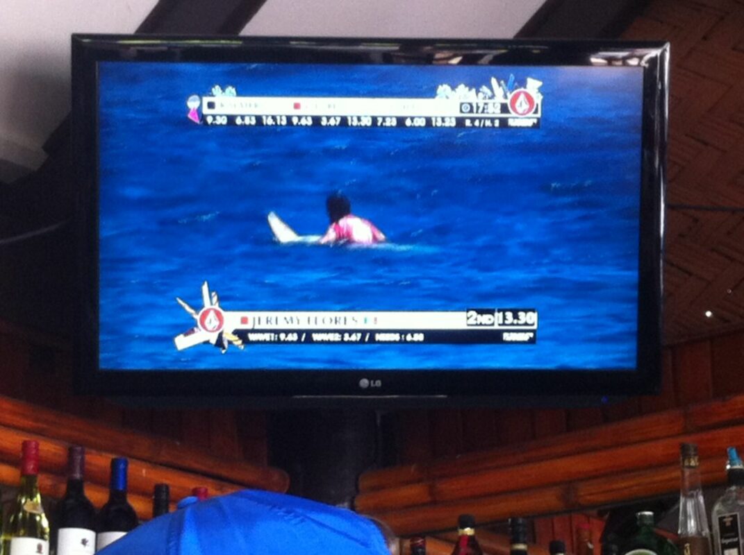 La compétition reprend enfin ! Jérémy Florès était 1ère série, je le vois donc de l’île principal, les bonnes vagues ont l’air vraiment difficiles à trouver mais il gagne cette série en surfant hyper bien. Je passe ensuite presque toute la journée à Tavarua à regarder la compétition. Je fais juste une petite session à Restaurants mais c’est petit et les séries sont lentes !