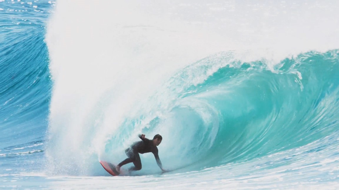 Pour clore la démonstration, un jet ski embarque le Tahitien pour le parachuter sur une bombe. Bien que la ligne prise ne lui ait pas permis de se mettre assez profond dans le barrel, on peut ressentir toute l’excitation entourant ce moment exaltant.
