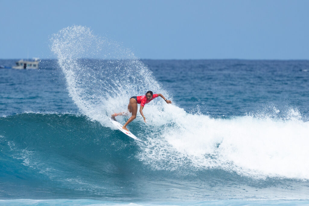 Vahine Fierro a elle aussi construit sa série pour monter dans les scores au fil des vagues. Sur sa troisième, la Tahitienne a envoyé un très gros roller de dos et fait tomber les points (7,67 pts). Elle signe le troisième meilleur total féminin du jour (13,50 pts), à bonne distance de la championne olympique américaine Carissa Moore, et remporte sa série devant Sarah Baum, qui représentera l’Afrique du Sud aux JO, et la canadienne Erin Brooks, vice-championne du monde ISA l’an dernier, qui rejoint donc sa compatriote Olin en repêchages.