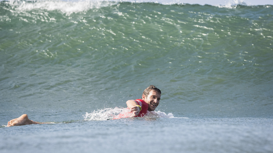Nous sommes sur le Round 4, premier heat. Un poing rageur frappe la surface de l’eau. C’est celui de Charly Martin, qui estime avoir été sous-noté à l’issue de sa dernière vague. Le Guadeloupéen retourne au pic en interpellant les juges à coup de grands mouvements de bras. Son score total est insuffisant et la sentence est irrévocable : élimination directe. Jorgann Couzinet figurait dans la même série que le « Gwada Boy ». « J’avais hâte de commencer », indiquait-ilaprès avoir remporté sa première série lors du Round 3. Le Réunionnais a lutté corps et âme pour venir à bout de ses rivaux du jour. Jusqu’à s’abîmer un orteil et le tibia pour exploiter sa dernière vague jusqu’au bout et terminer sa vaillante chevauchée dans les cailloux. « Tout se passe bien pour moi en ce moment, j’ai eu beaucoup de temps pour surfer depuis la semaine dernière et je me sens vraiment bien. Vivement la suite », affirmait Jorgann.