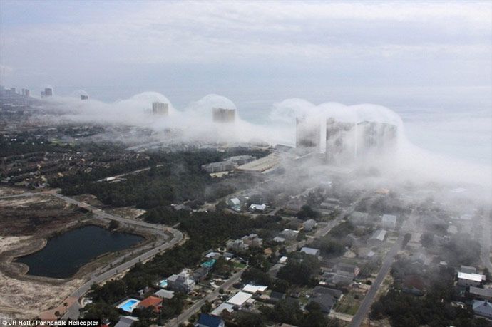 Non, ça n’est pas un montage photo, mais bien de véritables vagues de nuages. On pourrait croire à l’extrait d’un film de science-fiction, où une tempête pousserait l’océan à engloutir des immeubles. Il n’en est rien. Il s’agit en fait ici d’un phénomène météorologique bien connu, mais pourtant très rare dans ce genre de configuration géographique.