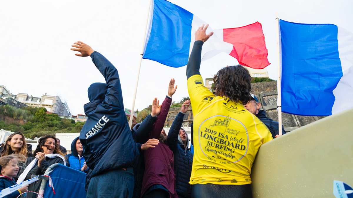 Contrairement à dimanche, un petit crachin est même venu jouer les trouble-fêtes. Mais c’est drapeau tricolore dans les mains que le clan français s’est dirigé vers le spot de la Côte des Basques afin d’aller soutenir Edouard Delpero, engagé dans la toute première série masculine de ces Mondiaux. Vêtues de leurs parkas, Alice Lemoigne et Justine Dupont ont encouragé leur équipier à l’instar des spectateurs.