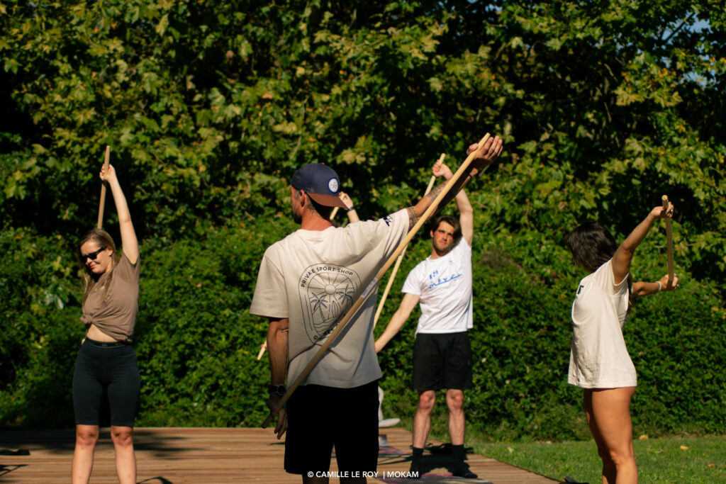 On a proposé des entraînements au poids de corps et sans matériel, accessibles à tous les niveaux. On a insisté sur le réveil musculaire, le warm up avant d’aller à l’eau, la mobilité articulaire pour prendre soin de son corps et la proprioception. On a aussi proposé des entraînements un peu plus cardio, mais toujours avec de la mobilité, pour aller un peu plus sur les filières énergétiques. L’idée est de montrer que même si le surf est un sport fun, il faut faire un minimum d’échauffements avant de rentrer dans l’eau, prendre soin de ses articulations pour bien vivre sa pratique et travailler certains points clés pour progresser. À savoir, travailler son équilibre, affiner son schéma corporel, renforcer ses épaules, mobiliser ses hanches, progresser en cardio… Des surf skates étaient aussi à disposition pour comprendre le rôle des bras et du transfert d’appuis en surf. C’était la logique de progresser après la session surf du matin, le moment idéal pour comprendre les remarques d’Amandine Sanchez (la professeure de surf présente sur le séjour, créatrice de Shining Surf School), corriger et appliquer directement à sec, pour espérer transférer le tout à l’eau, sur la session du lendemain.