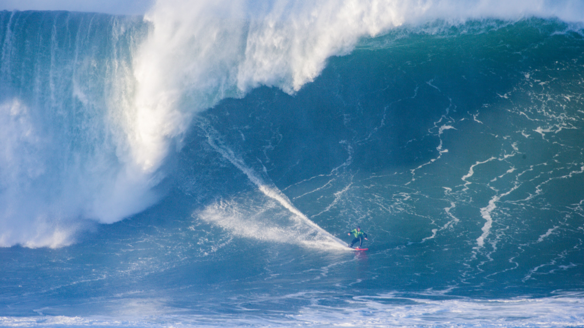 Rappelons-le, le beachbreak de Nazaré est considéré comme l’un des meilleurs spots de tow-in au monde pour le surf de gros. La présence d’un canyon sous-marin d’une centaine de kilomètres au large de la côte portugaise, dont la profondeur peut atteindre jusqu’à 5000 mètres en fonction des zones, concentre les houles qui viennent du large. Elles déferlent alors brutalement sur le rivage et forment les vagues sur lesquelles les dix-huit surfeurs se sont affrontés le temps d’une journée.