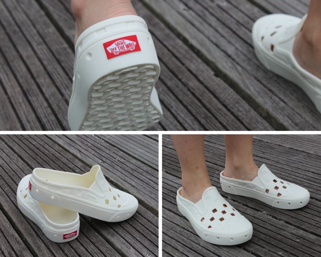 Un produit au look surprenant, on vous l’accorde. Ce modèle Slip-On TRK a été travaillé pour être une véritable « chaussure sandale », c’est donc tout naturel que visuellement on ne sache pas dans quelle catégorie l’inscrire. En revanche à l’utilisation, les doutes s’échappent vite. La paire de Vans s’enfile comme des tongs, mais au contraire de ces dernières accroche plus au pied grâce à sa coupe travaillée au talon. La paire qui se veut l’alliée du grand air, entre sorties plages, pêche et toute autre activité près de l’eau, joue très bien son rôle avec une bonne adhérence grâce à sa semelle gaufrée, sa respirabilité et sa composition monobloc synthétique, aucunement dérangée par l’eau. Au toucher, la matière est assez agréable et se rapproche de la douceur d’une gomme. Le modèle s’enfile, se jette dans un coin pour profiter d’être pieds nus par moment, se ré-enfile, se rince quand il prend un coup de poussière et s’embarque partout pour vous suivre dans vos journées d’été, de la plage au bar. Une simple note : attention au sizing, qui nous a paru un peu grand ! Il sera préférable de prendre une taille en dessous de votre taille habituelle chez Vans.