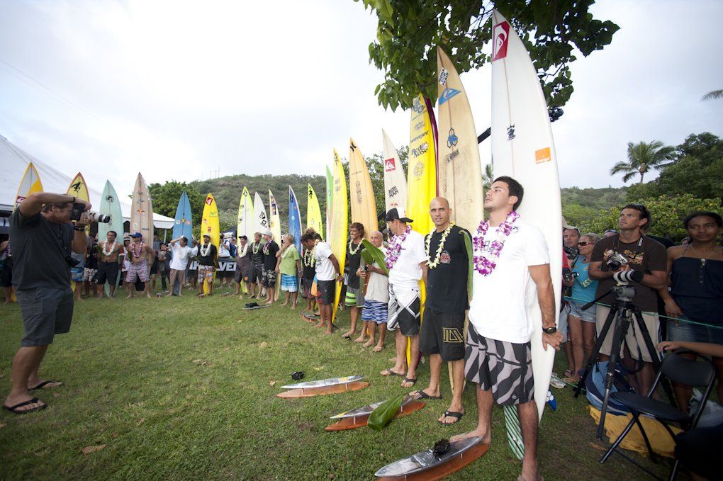 Malheureusement, blessé à la cheville depuis le Quiksilver Pro France, Jeremy vient d’annoncer qu’il ne pourrait pas défendre son titre au Billabong Pipe Masters, dernière épreuve du World Tour 2011. Une triste nouvelle pour le Français qui avait sans doute à coeur de surfer à nouveau cette vague qui lui avait si bien réussi l’an dernier. Si Jeremy ne sera donc pas sur le North Shore pour le mythique Pipe Masters, il a cependant fait un aller-retour à Hawaii, hier, pour participer à la traditionnelle cérémonie d’ouverture de l’Eddie, aux côtés de Kelly Slater, Shane Dorian, Sunny Garcia et des plus grandes légendes du surf de gros.
