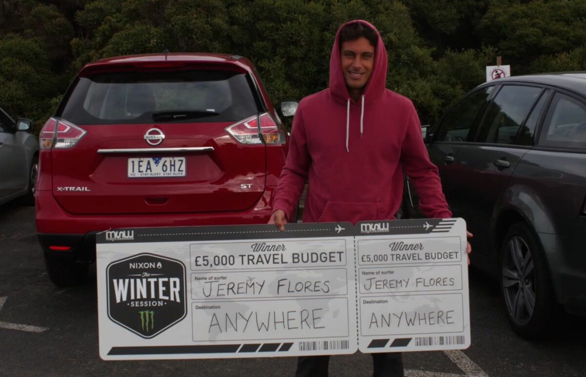 Parmi les premiers à dégainer son edit pour le concours tout début novembre, Jérémy a reçu cette semaine un cadeau surprise des mains de Belly, le team manager Quiksilver, sur le parking du Rip Curl Pro à Bells Beach : le chèque de 5 000 livres (6 500 €) du vainqueur de The Winter Session par Nixon.